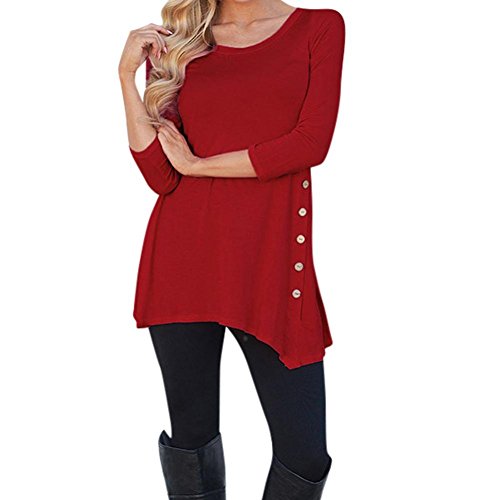 Women Blouse New Hot Sale Fashion Christmas Long Sleeve Loose Button Trim Solid Color Round Neck Tunic T-Shirt by Neartime (L, Wine).